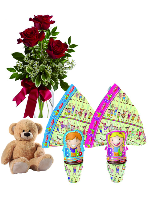 Tre rose rosse peluche e due uova pasqua: un delicato fascio di rose accompagnato da due regali pasquali. Un modo carino per augurare una buona Pasqua.